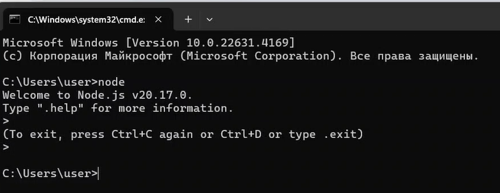 теперь если запустить консольку и написать node увидим что-то такое: