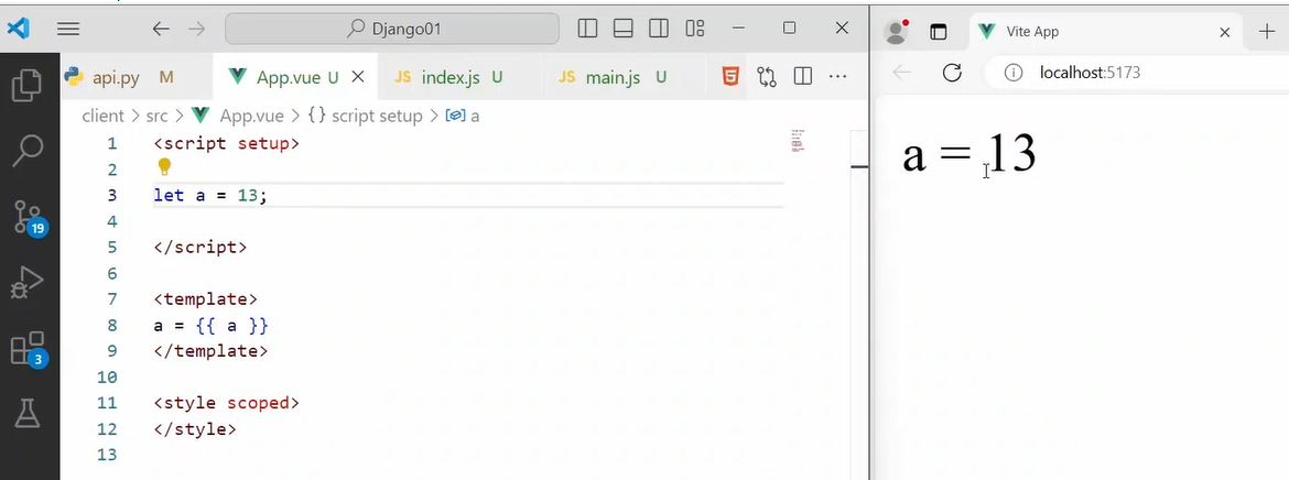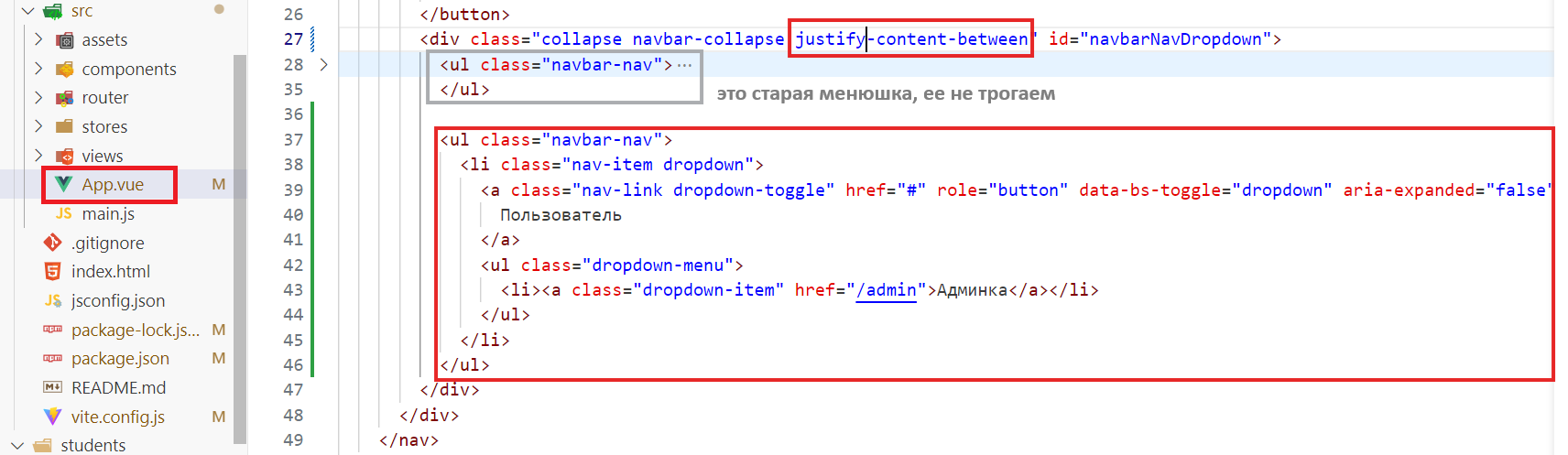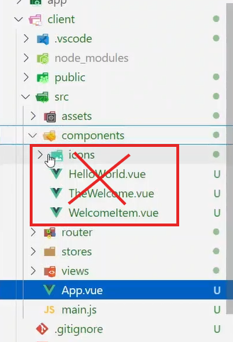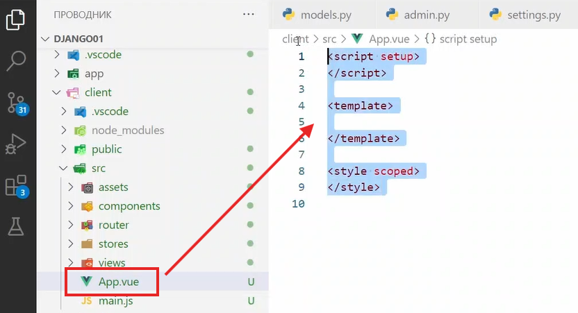 теперь удаляем все лишние из файлика App.vue, должно остаться только вот это