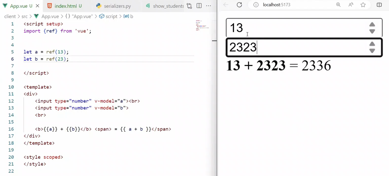 если хочется связать переменны с полями для ввода, надо объявлять их используя ref, а привязывать к полю для ввода через v-model