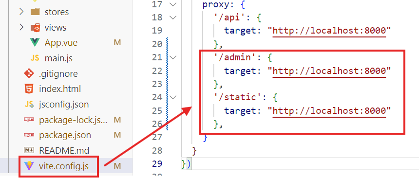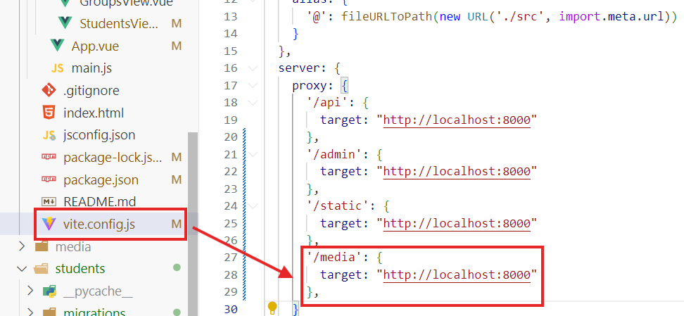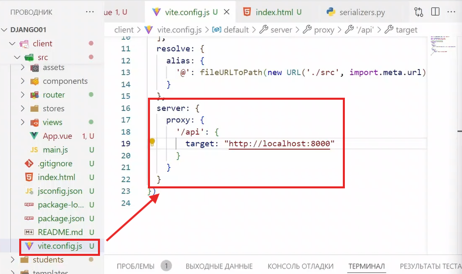 чтобы vue понимал, что запрос надо отправлять на сервер бэкенда, надо настроить прокси, для этого идем файлик vite.config.js и пишем туда: