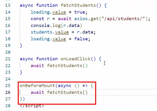чтобы список студентов загружался сразу при старте приложения можно использовать хук onBeforeMount